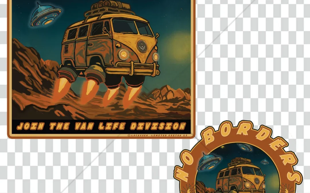 Plongez dans l’univers Van Life Division avec “NO BORDERS”, un design inspiré par la liberté du Combi Volkswagen et la créativité rétro des années 70.