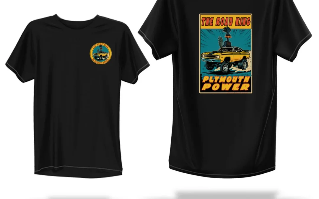 Exemple de t-shirt imprimé avec le design exclusif “The Road King – Plymouth Power”. Inspiré de la Plymouth Road Runner 1970 et revisité en style comics rétro, ce visuel fait partie d’une série limitée de 25 fichiers pensée pour le DIY ou les plateformes d’impression. La mascotte beep beep apporte la touche funky et muscle car emblématique de l’univers Lacassen.