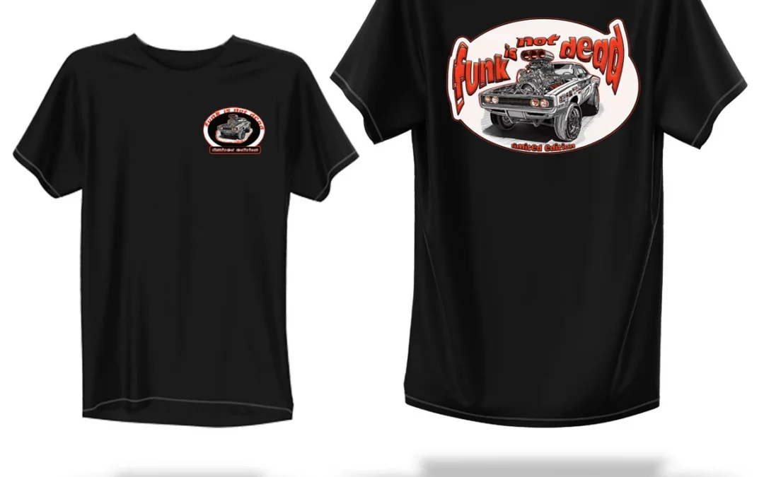 Exemple du rendu final du design « BIG BLOCK 454ci Edition » appliqué sur un t-shirt noir. Le visuel principal est imprimé au dos, accompagné d’un patch avant collector. Idéal pour apprécier la mise en situation réelle avant achat.