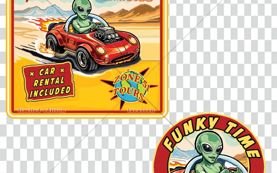 Illustration rétro originale Funky Time – Area 51 Tours, inspirée des miniatures mythiques des années 1970 et de l’imaginaire science-fiction.