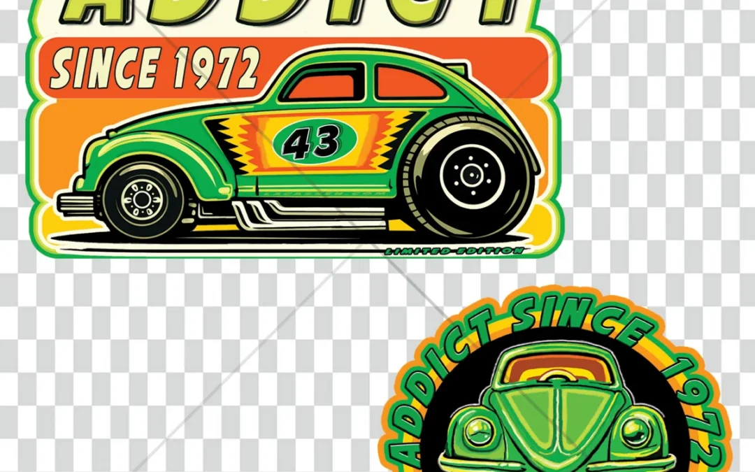 une illustration rétro d’une Cox transformée en dragster, inspirée de l’esthétique des jouets Superfast des années 70.