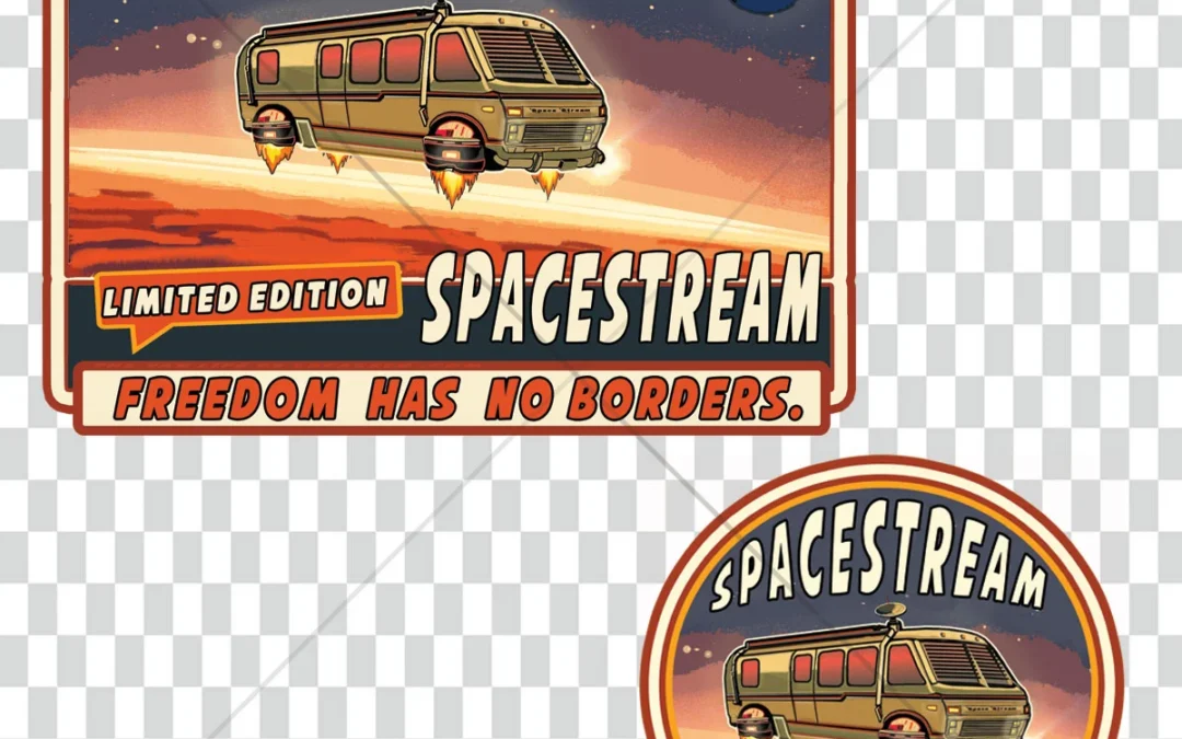 Illustration de présentation du pack digital SpaceStream – The Van Life comprenant un design dos et un badge face.